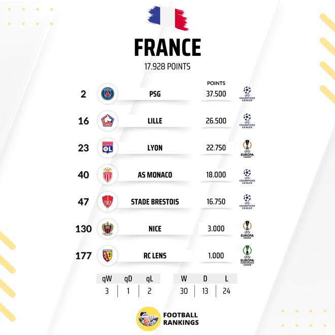法国球队欧战积分排名:巴黎欧洲第2,里尔第16,里昂第23